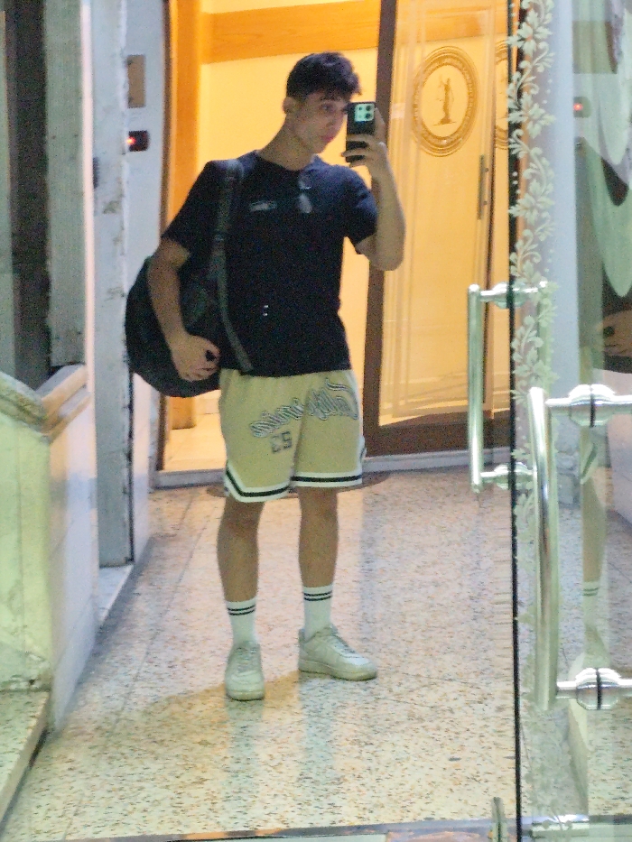 A young adult male stands in an indoor hallway or entrance within As-Salihiya Municipality, Syria, taking a mirror selfie with a dark-colored smartphone held in his right hand. He wears a black short-sleeved t-shirt with dark sunglasses hooked onto the collar, beige athletic shorts featuring white and black trim with "saint" and "29" graphics, white crew socks with two black stripes, and white athletic sneakers. A dark shoulder bag is carried over his left shoulder. The flooring consists of light-colored, speckled terrazzo tiles. To the left, a light-colored wall or pillar shows a small dark rectangular object. In the background, a wooden door frame opens to an illuminated interior with a warm yellow glow. The reflective surface on the right, likely a glass door, displays a vertical decorative etching of vines and leaves, a metallic pull handle, and the reflection of an ornate, circular golden emblem depicting a classical figure situated further back in the reflected space.