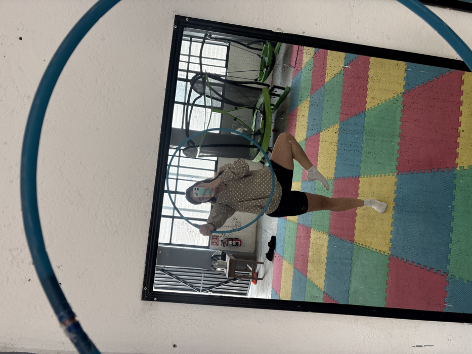 This image depicts an indoor mirror selfie taken in a recreational space or gym in Puebla, Mexico. The precise location within the city is not discernible from the visual information. The central subject is a female reflected in a large, black-framed rectangular mirror. She has long, dark hair, wears glasses, and is taking the photograph with a smartphone held to her face, partially obscuring it. She is dressed in a light-colored, long-sleeved shirt with dark polka dots, black athletic shorts, and white socks. She holds a turquoise hula hoop in front of her with both hands and is balancing on her left leg, with her right knee bent and foot raised. The floor within the reflected room is covered with interlocking foam mats in a checkered pattern of red, yellow, blue, and green. In the background of the reflection, large windows with dark frames and vertical bars are visible, behind which appears a green trampoline structure and other recreational equipment. To the left within the reflection, a light-colored wooden stool and a red fire extinguisher mounted on the wall are present. A pair of dark shoes rests on the foam floor near the stool. The wall surrounding the mirror is white and textured, and a curved blue object, possibly part of another hula hoop, partially frames the top of the image outside the mirror's reflection.