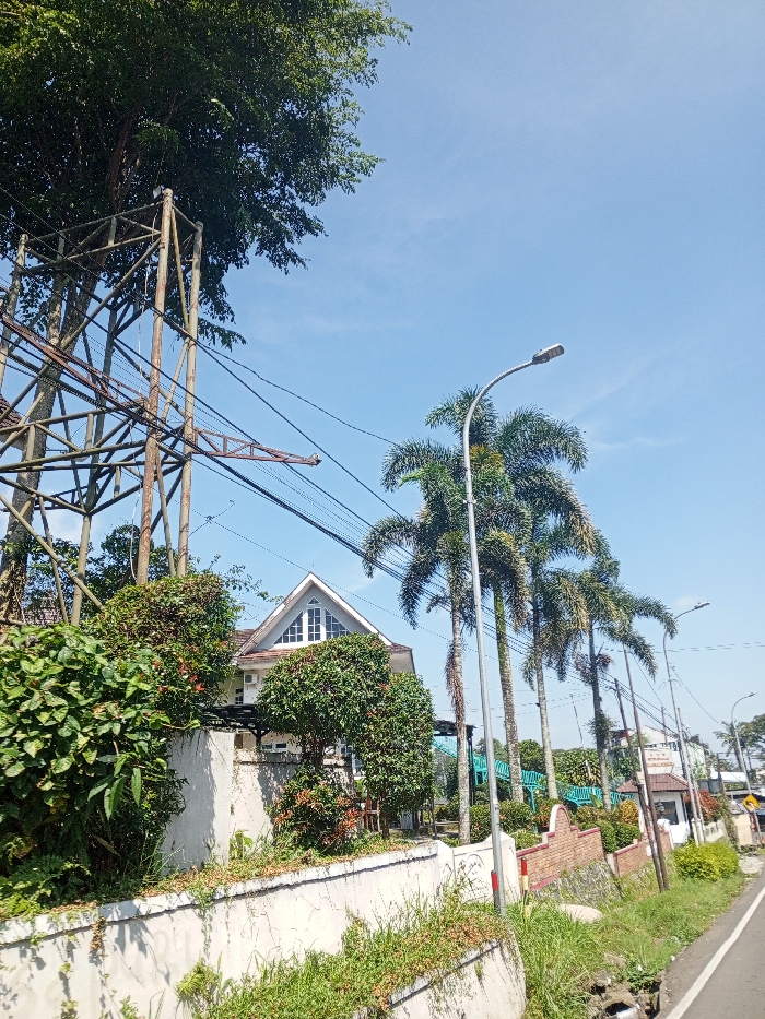 The image displays an outdoor scene in Multhan, India, under a clear blue sky with minimal cloud cover. In the lower left foreground, a white concrete retaining wall, partially covered with green grass and weeds, extends horizontally. Adjacent to the right of this wall, a dirt and grass bank slopes towards a paved road, which is visible along the lower right edge of the frame. A narrow concrete culvert runs parallel to the road. In the midground, a two-story white residential structure with a reddish-brown gabled roof is partially visible, featuring a prominent multi-pane window arrangement on its upper facade. This house is fronted by dense green bushes and smaller trees. To the right of the house, a section of a decorative wall constructed with red bricks and stone is present, also topped with foliage. Multiple tall palm trees with green fronds rise to the right of the house. A grey street light pole, equipped with a modern LED luminaire, stands between the house and the palm trees. Numerous dark utility cables are strung across the frame, connecting various utility poles. On the far left, a large, green-leafed tree partially obscures a tall, rusted metal lattice structure, from which additional utility lines extend. No people or animals are present. The scene is static, depicting a sunny urban or suburban environment.