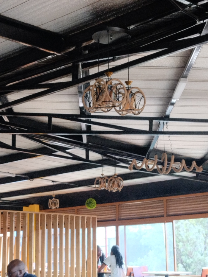 The scene is an interior view within Thika Township ward, Kenya, likely a restaurant or lounge. The ceiling features a dark metal truss structure supporting a light-colored, corrugated, insulated roof. Multiple decorative light fixtures are suspended from the ceiling. A cluster of three circular, open-frame chandeliers, constructed from woven rope and containing internal glass shades, hangs centrally. To the right, another elongated, horizontally oriented light fixture made of coiled rope is visible. A smaller, single circular rope-wrapped fixture hangs further left. A vertical wooden slatted partition partially divides the space on the left. A spherical green moss decoration is suspended near this partition. In the background, large windows with wooden slat blinds at the top offer a view of outdoor greenery. Three individuals are discernible within the space. In the lower-left foreground, the left side of a person's head and shoulder is visible; they have dark skin, a bald head, and wear glasses. In the mid-ground, near the windows, two individuals are standing. One individual, with long dark dreadlocks and wearing a light-colored t-shirt, stands with their back partially to the camera. Facing them, another individual with dark skin wears a dark top. They appear to be interacting near a table, with partial views of other tables and chairs in the background.