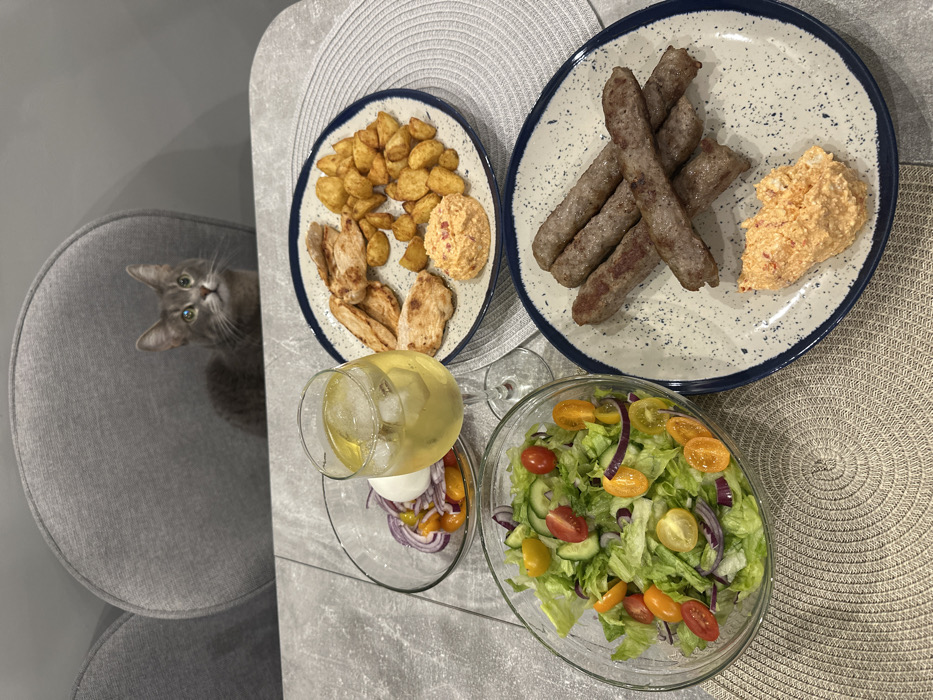 The scene depicts a dining table laden with food, observed by a domestic cat, located in Vratsa, Bulgaria
