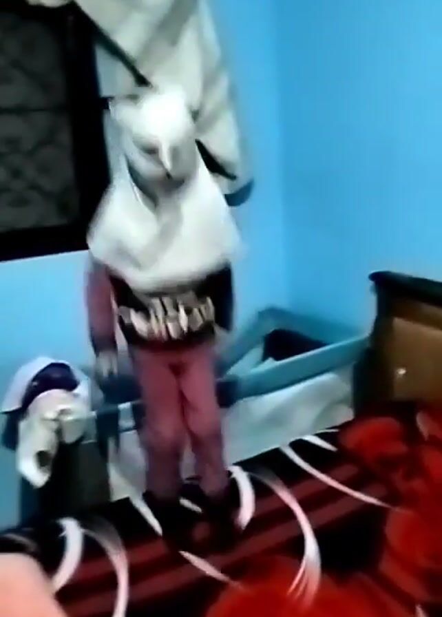 A person wearing a white head covering, a shirt with an obscured graphic, and purple pants walks into a room, drops a helmet, and jumps onto a bed. The bed has a red and black floral patterned comforter. The room has light blue walls. A crib is visible in the background. A hanging white garment can be seen.