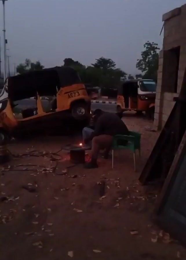 At night, a man is welding in an outdoor area. He sits on a green plastic chair, wearing dark pants and a dark long-sleeved shirt. The welding produces bright orange sparks. Behind him is an overturned yellow tricycle with the license plate AC73. The scene is dimly lit but brightened by the welding sparks and an additional light source. In the background are trees, a brick wall, and other parked tricycles.