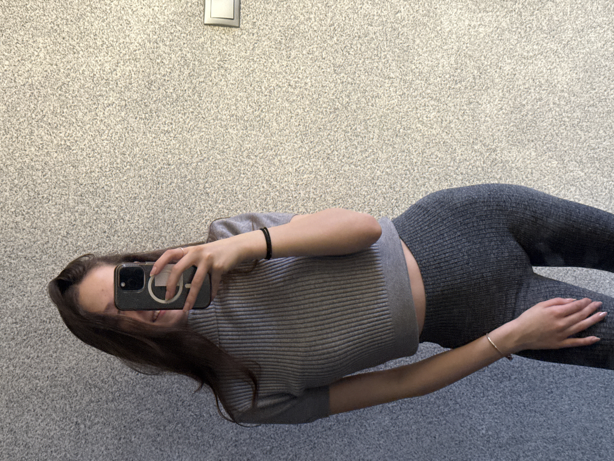 A woman is taking a selfie in front of a wall. The wall is gray with a light texture and has a light switch near the top. The woman is wearing a gray, ribbed crop top and matching leggings. She is holding a smartphone with a dark-colored case and a white, circular object attached to the back. Her hair is long, dark brown, and partially obscures her face. She is wearing a black bracelet on her left wrist and a gold bracelet on her right wrist. The location is not identifiable as Sofia, Bulgaria, from the image.