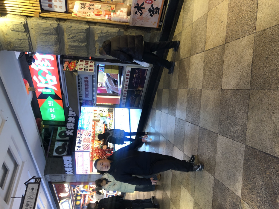 A man in a dark jacket and pants stands near a shop with bright signage in Chinese characters. The signage includes "冰糖葫", "垢街", and "两江游". Other signs mention tourist services, ticket sales, and boat tours. Several people are seen walking near the shop. The flooring is tiled in light and dark grey squares. There's also a bamboo structure near the top of the image.