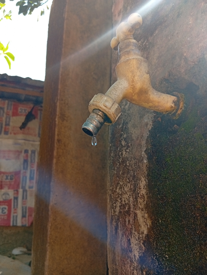 An outdoor scene in Unknown, Unknown, features a brass-colored metal water tap affixed to a textured, possibly concrete, wall. The tap, equipped with a white plastic handle and a metal hose connector at its spout, is leaking a single, clearly visible water droplet. The wall to which the tap is attached is covered in patches of dark green moss and exhibits signs of discoloration. To the left of the tap, a light brown column or section of wall is visible. Beyond this, in the mid-ground, a structure or wall constructed partly from stacked white bags with red printed details is present. The upper left corner shows green foliage against a bright, hazy sky. Strong sunlight illuminates the scene from the upper right, creating prominent lens flares across the image. No individuals are present.