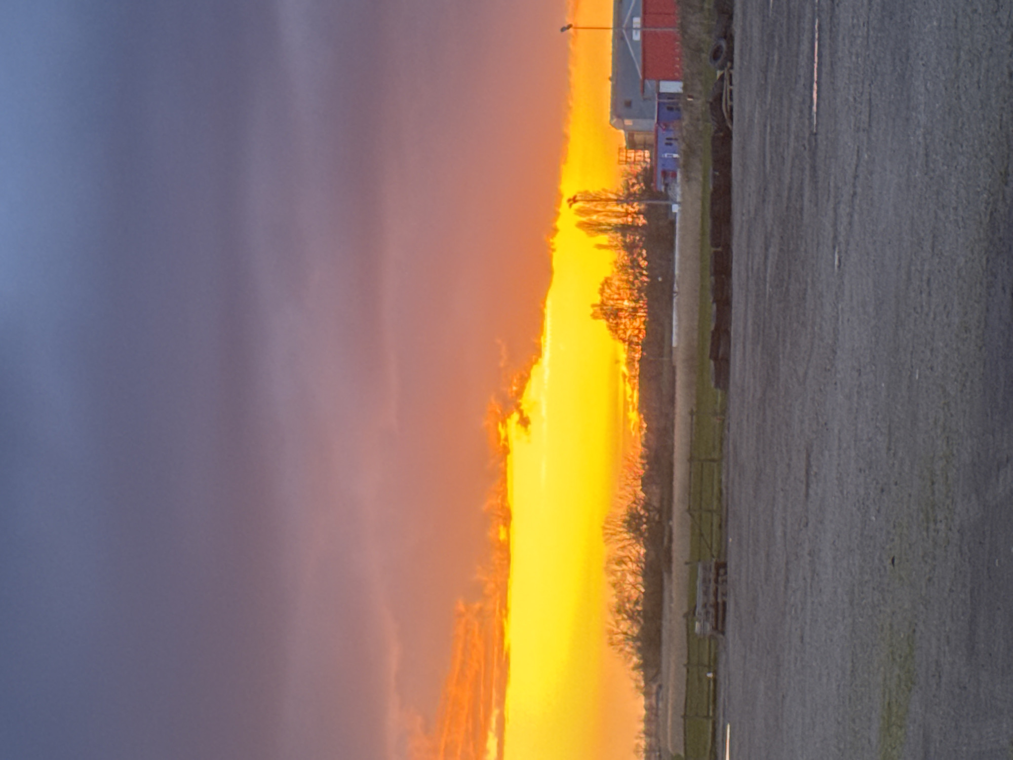 sunset scene in Caister-on-Sea, United Kingdom. To the left is a grey-blue sky darkening into twilight. A vibrant orange and yellow sunset fills the center of the image, with light obscured by what appear to be tree branches and possibly buildings. To the right is an asphalt or gravel area with hints of green vegetation at the edge of the road. A building can be partially seen in the upper right corner, with red and blue accents. The image is oriented sideways.