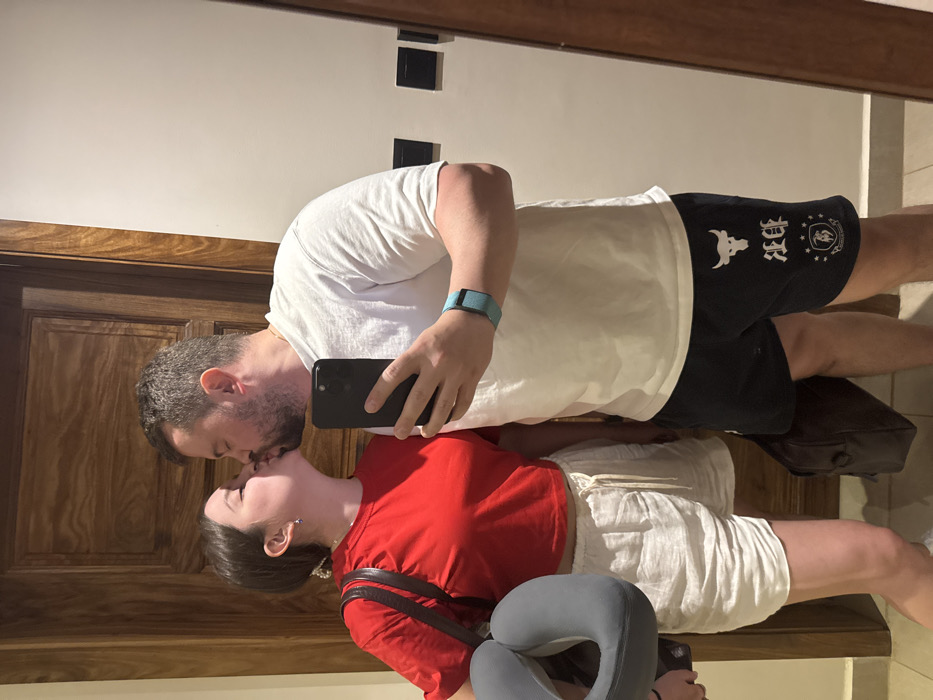 A couple kisses while taking a selfie in a mirror. The man wears a white t-shirt, black shorts, and a blue fitness tracker. The woman wears a red t-shirt, white shorts, and a gray neck pillow hangs around her neck. A purse is on the floor next to the man. The reflection includes a wooden doorframe and a white wall.