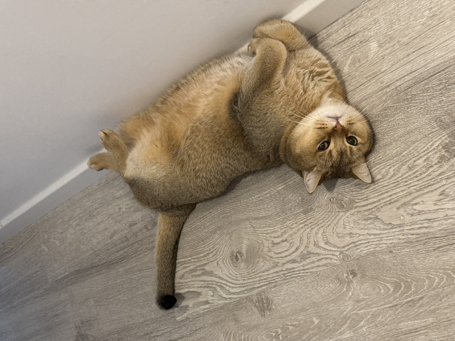 - "A golden British Shorthair cat lies on its back near a white wall" by FM-hin5S2, licensed under CC BY 4.0