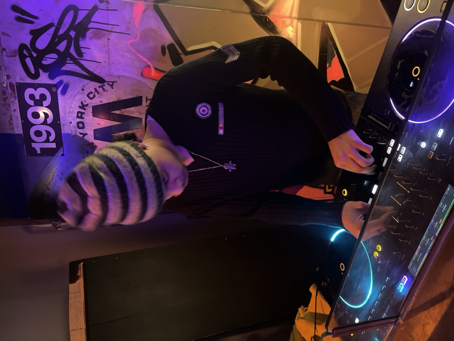 A person in a striped beanie and black sweater stands beside a DJ turntable. They are facing the turntable and appear to be adjusting the controls. Graffiti and the words "New York City" and "1993" are visible on a wall behind them. The turntable features blue and white circular lights. The overall lighting is dim and ambient.