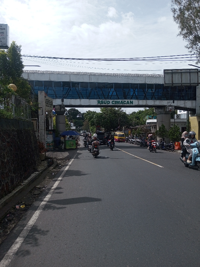 A street view showcases the “RSUD Cimacan” pedestrian bridge spanning a road filled with motorcycles. The bridge features a blue-tinted, enclosed walkway. Various motorbikes and scooters are visible, some with passengers. Street-side vending and parked motorcycles line the side of the road. A brick wall runs along the left side, while trees and a sign stand tall near the bridge's entrance. The sky above is partly cloudy.