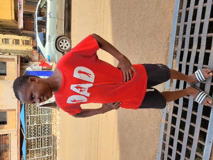 A young male stands on a metal storm drain grate on a street in Onitsha, Nigeria