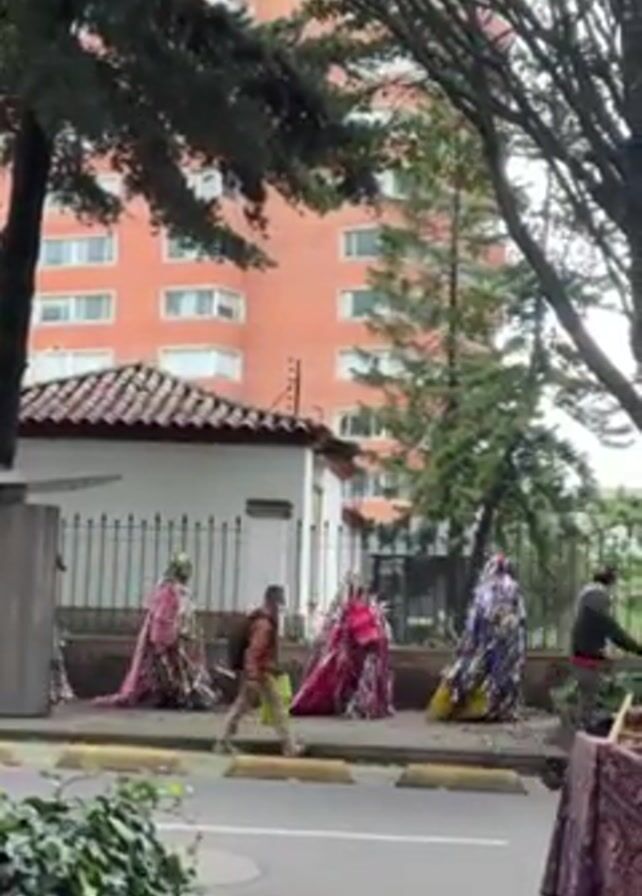 The camera is filming from across a city street on a cloudy day. On the sidewalk across the street, there are five people dressed in colorful, fringed costumes with hoods. A man walks from left to right across the street in the foreground wearing a white t-shirt and red cardigan. The camera shifts slightly to the left. Behind the costumed people is a tall red brick building and a small white building with a low fence and a brown-tiled roof. A man on a scooter and a man walking are on the sidewalk next to the costumed people. A man on a bicycle rides behind the costumed people from left to right. Trees partially frame the shot.