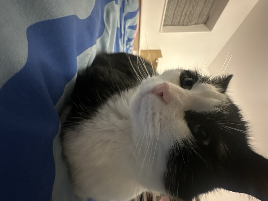 - "A tuxedo cat with white fur on its face and chest is nestled on a blue and white patterned surface" by FM-sKHBD2, licensed under CC BY 4.0