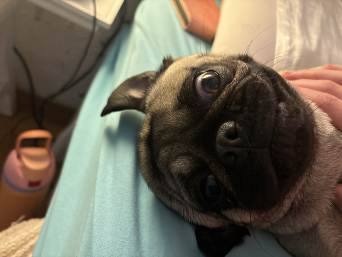 The image displays a fawn-colored pug dog situated indoors in La Herradura, Mexico. The dog's head occupies the central foreground, tilted, with its large, dark eyes directed towards the camera. Its distinctive wrinkled forehead and dark muzzle are clearly visible. A human hand, with visible fingers, is positioned on the right side of the frame, resting on the dog near its neck and upper body. The pug is supported by a light blue fabric surface, likely clothing or bedding. In the blurred background to the left, a two-tone pink and orange water bottle with a handle is partially visible. Further back, out-of-focus electrical wires and a segment of a white object are discernible. A light-colored, textured fabric element is also present in the lower left corner of the frame.
