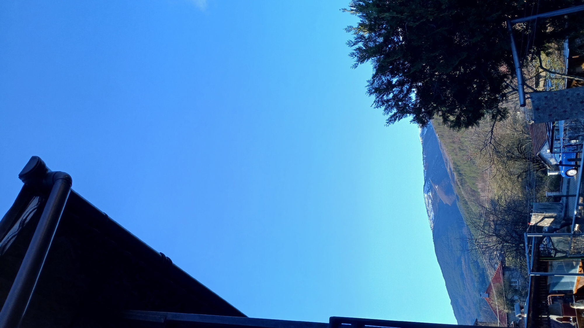 The image presents a panoramic view of Svidnya, Bulgaria, under a clear, bright blue sky. The upper left corner is occupied by the dark brown eaves and gutter system of an unseen structure, angled downwards. A dense, dark green coniferous tree is visible in the lower right, partially obscuring the view. The midground reveals a residential landscape featuring several houses with visible red-tiled roofs, nestled among a mix of bare deciduous trees and scattered evergreens. Fencing and stone or concrete walls delineate properties. In the lower-left quadrant, a pen-like enclosure contains a light-colored animal, possibly poultry. A bright blue compact car, likely a hatchback or small SUV, is parked on a street or driveway, partially visible behind fencing and vegetation. Overhead, thin utility lines traverse the scene. The background is dominated by a prominent mountain range. The upper slopes display visible patches of snow, while the lower and mid-slopes are forested with a combination of coniferous trees and leafless deciduous trees. The entire scene is illuminated by direct sunlight. No human figures or discernible actions are present.