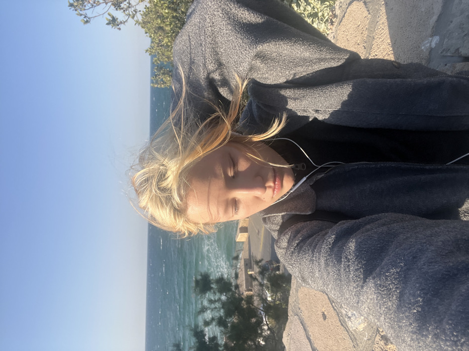 A single individual, appearing female with fair skin and windblown blonde hair, is depicted in a selfie taken on a sunny day in Tel-Aviv, Israel. The subject, estimated to be between 20-30 years old, wears a dark grey fleece jacket over a black zippered turtleneck and white wired earbuds. Her gaze is directed downwards, away from the camera, with a neutral expression. Her right arm is raised, with the hand partially obscured, possibly holding the camera phone or adjusting her wind-swept hair. The scene is set on a stone-walled promenade or viewpoint overlooking the Mediterranean Sea, characteristic of the Old Jaffa area in Tel-Aviv. The immediate foreground features irregular, light-colored stone blocks forming a retaining wall. In the mid-ground, a paved, winding road descends along the cliff face towards the water, with a dark vehicle partially visible. Green coastal vegetation, including bushes and small trees, is present on the cliffside. The Mediterranean Sea in the background exhibits moderate waves and whitecaps under a clear, light blue sky. Strong, direct sunlight illuminates the scene, suggesting daytime, likely late afternoon, with warm light and distinct highlights on the subject's hair. The topography, with a cliffside promenade, stone walls, and a descending road overlooking the sea, specifically points to locations such as the promenade near Kedem Street or adjacent to the Jaffa Port.