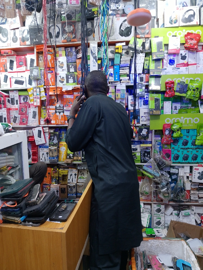 A man wearing a black tunic speaks on a phone in an electronics store. Colorful packaging for headphones, earbuds, and other electronic accessories fills the shelves. Cables hang from the ceiling. Phones and cases are piled on a wooden countertop. A partially visible orange light fixture illuminates the scene.