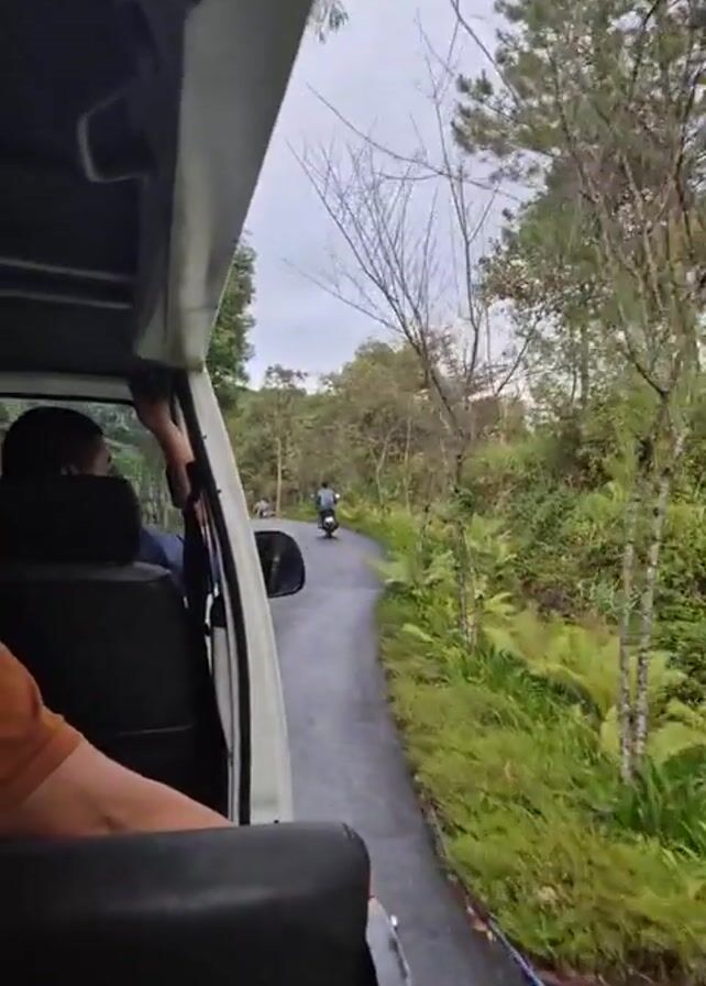 A white jeep travels on a paved road. The road winds through a lush, green landscape featuring trees, ferns, and various plants. The sky appears overcast. Inside the jeep, three people are visible. One person in the front is wearing an orange shirt, another is wearing a blue shirt, and a woman in the back is wearing a maroon long-sleeved shirt. The woman is holding onto the vehicle's interior for support as the jeep navigates the road. The camera is inside the jeep, capturing the view from the passenger area. A motorcycle is briefly seen ahead on the road.