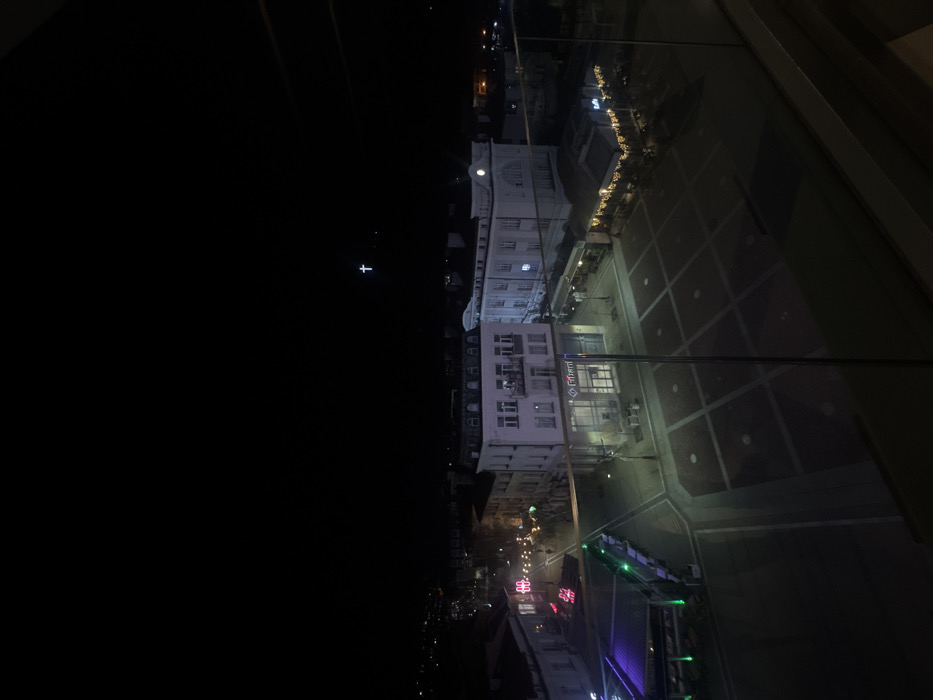 An elevated, nighttime view captures a section of a city square and surrounding urban landscape in Blagoevgrad, Bulgaria. The upper third of the image is dominated by a dark, clear sky, with a prominent white illuminated cross visible against the blackness in the upper middle distance, likely situated on a hill or distant structure. The central focus at ground level is a paved pedestrian square with a grid pattern, illuminated by streetlights. To the left-center, a multi-story building with a light-colored facade features balconies on its upper floors and a ground-level business identified by a "Fibank" sign above its entrance. To the immediate right of this building is another multi-story structure of similar architectural style, also with a light facade, distinguished by a decorative arched element and a visible clock face positioned near its roofline. On the far left, a street or pedestrian pathway extends into the distance, lined with various commercial establishments displaying vibrant neon signage, including pink/red "24" and "club" indicators. Approximately five indistinct human figures are visible walking on this pathway, illuminated by the ambient light. To the right side of the square, an outdoor dining or seating area is present, adorned with numerous string lights, suggesting a café or restaurant. The foreground reveals a portion of a transparent barrier, likely glass, from the elevated vantage point, with minimal reflections visible. The overall scene indicates a calm urban environment during evening hours.