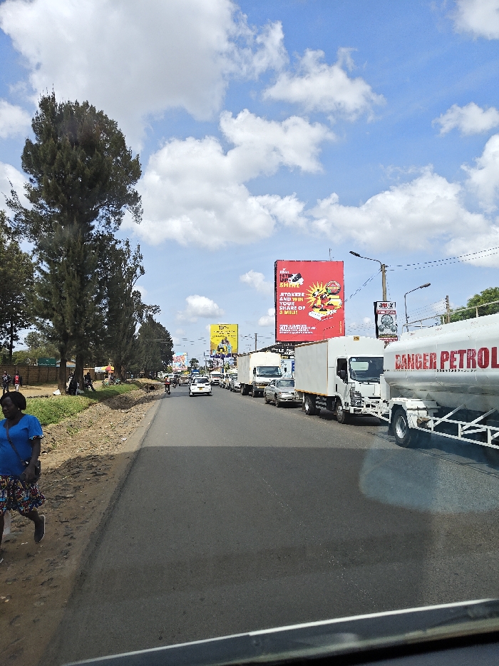 A daytime street scene features a line of vehicles, including a large tanker truck labeled "DANGER PETROL," parked on the right side of a two-lane road. A woman walks along the roadside on the left. Billboards are visible in the background, one red and one yellow. The sky is partly cloudy. The image appears to be taken from inside a vehicle.