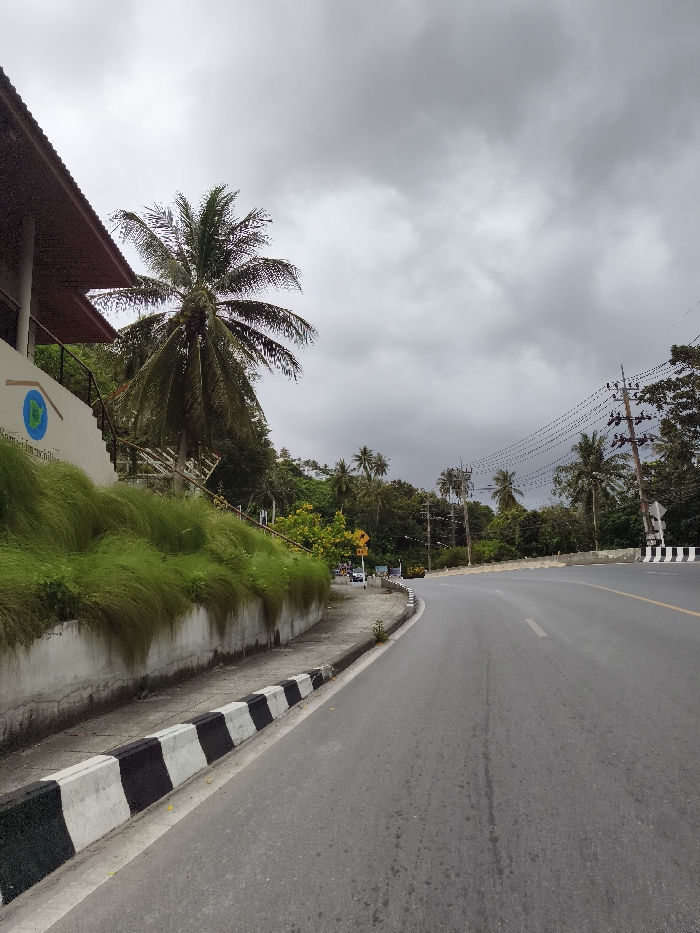 A winding asphalt road curves into the distance under a cloudy sky. On the left, a building's façade is adorned with lush green vegetation, bordered by a curb with alternating black and white stripes. Utility poles with wires run along the right side of the road, lined with palm trees. The overcast sky casts a dim light, giving the scene a muted tone.