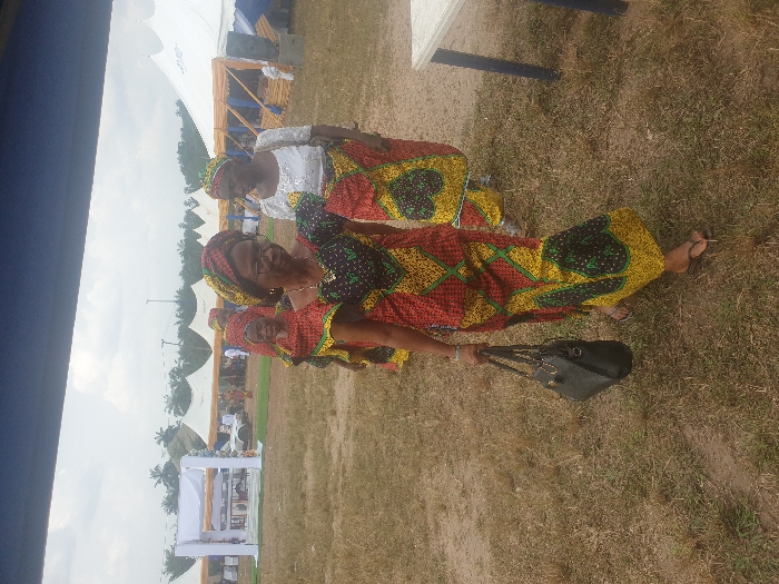Three women stand outdoors in colorful African print dresses and headwraps. The woman in the front carries a black handbag. Behind them are two additional women, one in a white top. They are on grassy ground with tents visible in the background. The sky is overcast.