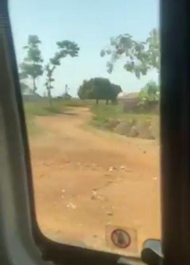 view from a car window. The car is moving along a dirt road, passing by fields and buildings. The buildings appear to be houses, and there are trees visible. The sky is clear. A no smoking sign is visible on the window.