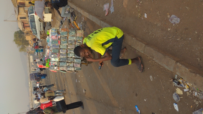 The image depicts a bustling roadside scene in Nyanya, Nigeria, characterized by a mix of pedestrian activity, street vending, and visible litter