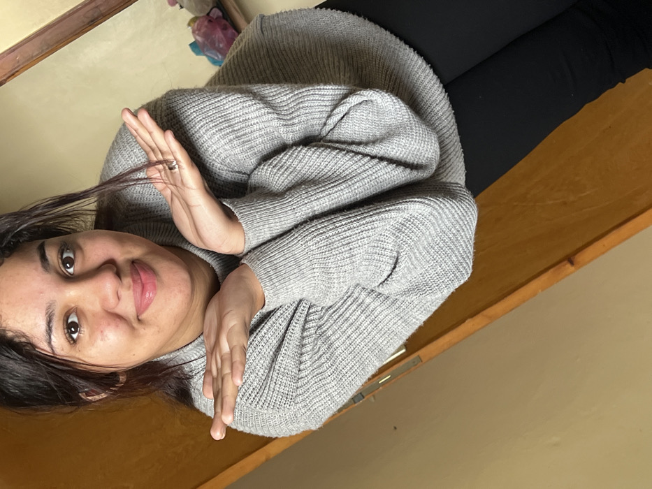 The image displays a female adult, estimated to be in her twenties or thirties, situated indoors within what appears to be a residential setting in Salé, Morocco. She has dark hair, a light to medium complexion, and is looking directly at the camera with a slight smile. The subject is wearing a light grey, ribbed knit, long-sleeved sweater and black leggings or trousers. Both hands are raised symmetrically to approximately shoulder height, with palms open and facing upwards. A ring is visible on the fourth finger of her left hand. The background features a light-colored wall and a prominent diagonal wooden surface, likely part of a shelf or furniture. In the upper right background, several indistinct, small objects, including items that appear to be decorative or crystalline in pink and blue hues, are partially visible on a shelf.