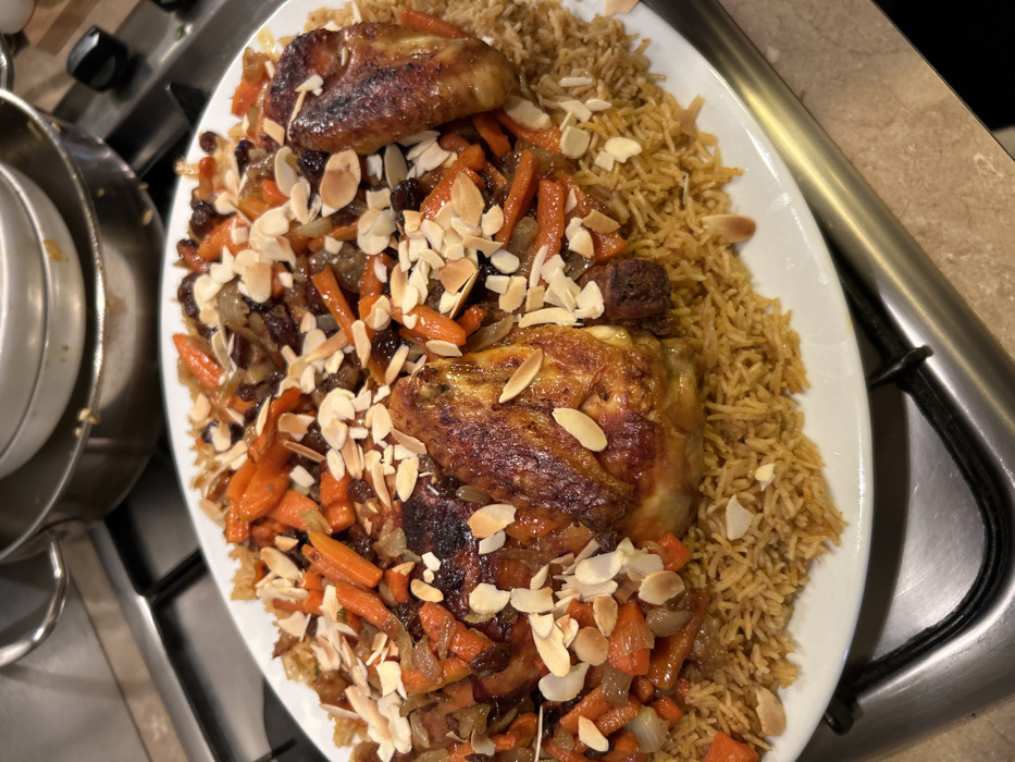 A large, white, oval serving platter is centrally displayed, filled with a prepared meal. The dish features a base of light brown, long-grain rice, topped with multiple pieces of roasted chicken exhibiting browned, crispy skin. Layered over the chicken and rice is a mixture of sautéed vegetables and dried fruit, specifically baton-cut orange carrots, translucent sliced onions, and dark raisins. The entire meal is generously garnished with slivered almonds. The platter rests on a light-colored, speckled kitchen countertop. In the blurred background, a black gas hob with metal grates is visible, along with stacked stainless steel pots and bowls. No people, actions, or interactions are depicted. The visual information within the image does not provide details to ascertain a specific location within the city of Saint-Quentin, France.