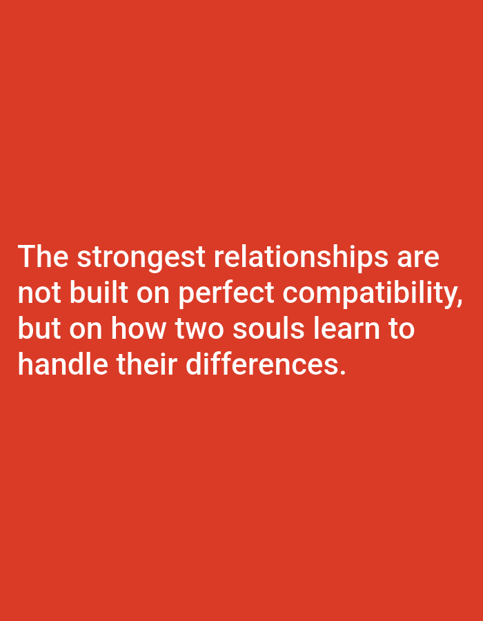The image displays a solid red background. Centered on the lower half of the image is white text, rendered in a sans-serif typeface. The text reads: "The strongest relationships are not built on perfect compatibility, but on how two souls learn to handle their differences." There are no visual elements depicting a physical location, individuals, subjects, objects, actions, or interactions, and therefore no identifiable scene or specific location within the city of Novo Delchevo, Bulgaria, can be described from the image content.
