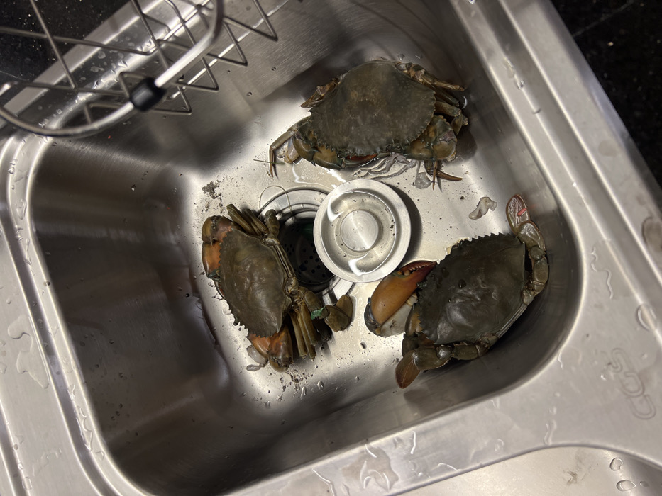 The scene depicts the interior of a stainless steel kitchen sink, located in Kerobokan Kelod, Indonesia. Within the basin, three live mud crabs (*Scylla serrata*) are observed. The sink's surface is wet, marked by numerous water droplets and streaks. A circular drain opening with a metal grate is visible centrally, with a detached, polished stainless steel drain cover resting immediately to its left. A portion of a metal wire dish drying rack extends into the frame from the upper right, positioned over the sink. One crab, with its claws secured by a green band, rests near the drain opening. A second crab is positioned in the lower-left curve of the sink, displaying a prominent orange-red claw. The third crab lies on its side in the lower right section of the basin. Small quantities of dark, gritty detritus are dispersed across the sink's floor, notably around the crustaceans. No human subjects are present, and the crabs appear stationary.