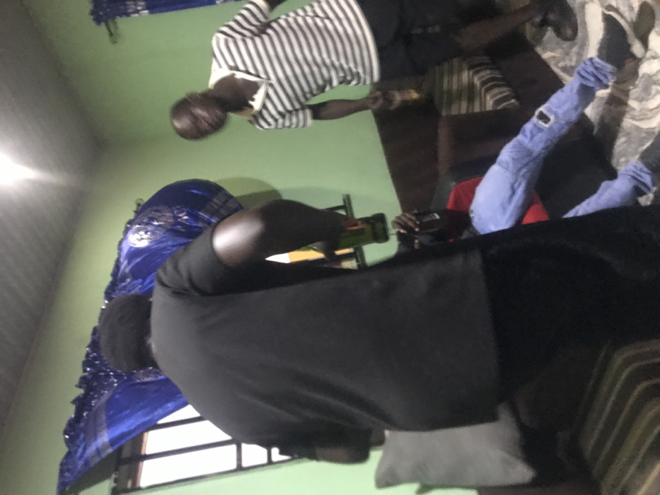 The image portrays an indoor scene within a residential or casual social setting in Lagos, Nigeria