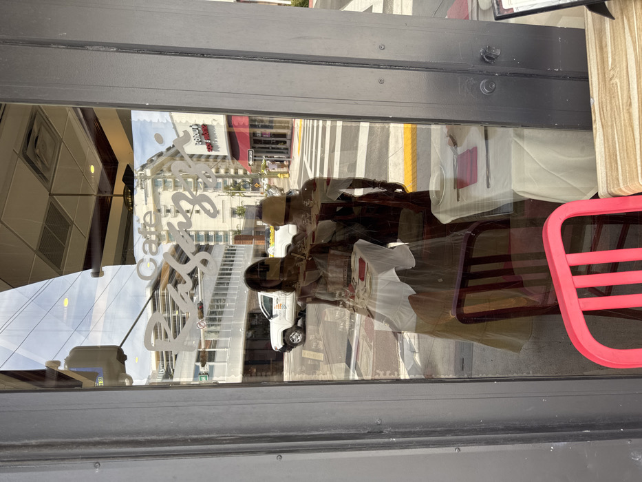 This image provides a forensic view through the reflective front glass window of "Cafe Ragazzi" in Surfside, Florida, United States