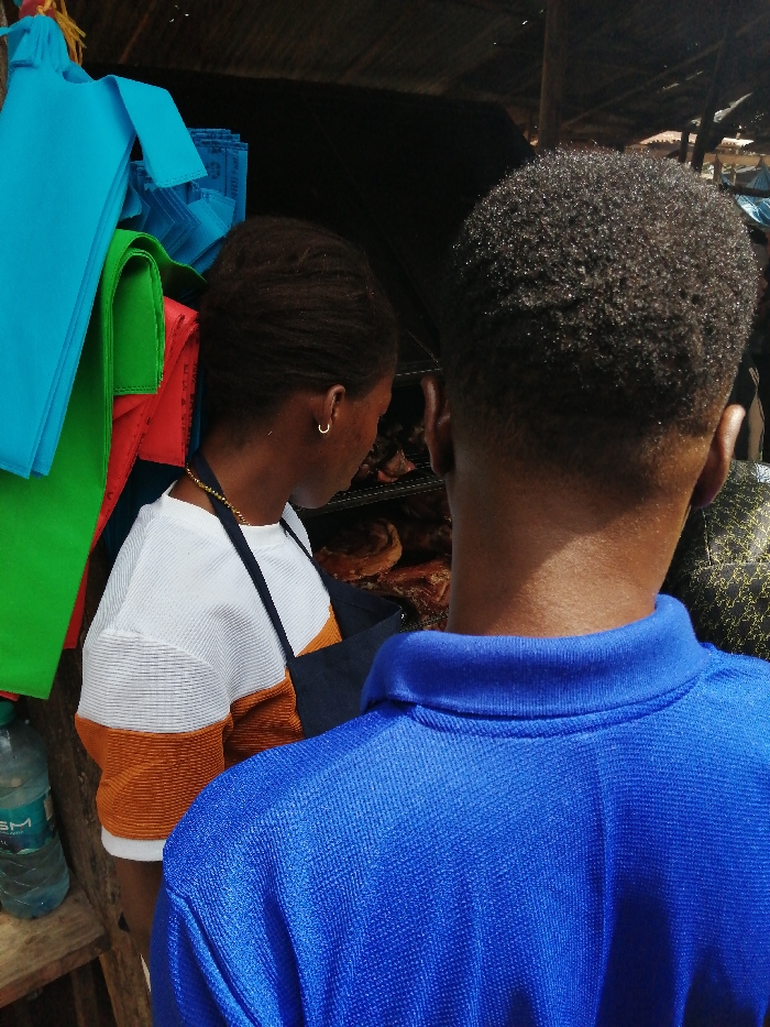 The scene depicts an outdoor market stall in Machinjioni, Tanzania, featuring two individuals and various goods