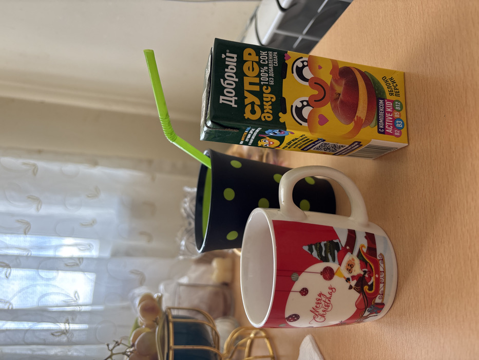 The image depicts a static indoor scene on a light brown table in a room located in Sisian, Armenia. In the foreground, from left to right, are three items: a white ceramic mug with a handle, decorated with a red "Merry Christmas" graphic featuring Santa Claus in a sleigh, pine trees, and ornaments; a black cylindrical cup with lime green polka dots, containing a lime green liquid and a bent lime green plastic straw; and a rectangular juice box. The juice box is green and yellow, displaying Russian text including "Добрый супер джус 100% сок без добавления сахара" (Good Super Juice 100% juice without added sugar), cartoon characters, and an image of a sliced peach, along with "ACTIVE KID" and "Apple Peach" indications. In the blurry background, a window covered by sheer white curtains with a faint patterned design is visible, admitting soft natural light. To the left, a portion of a decorative stand holding light-colored grapes is present. On the right, a white radiator or heating unit is visible. No individuals are present, and no actions or direct interactions are occurring.