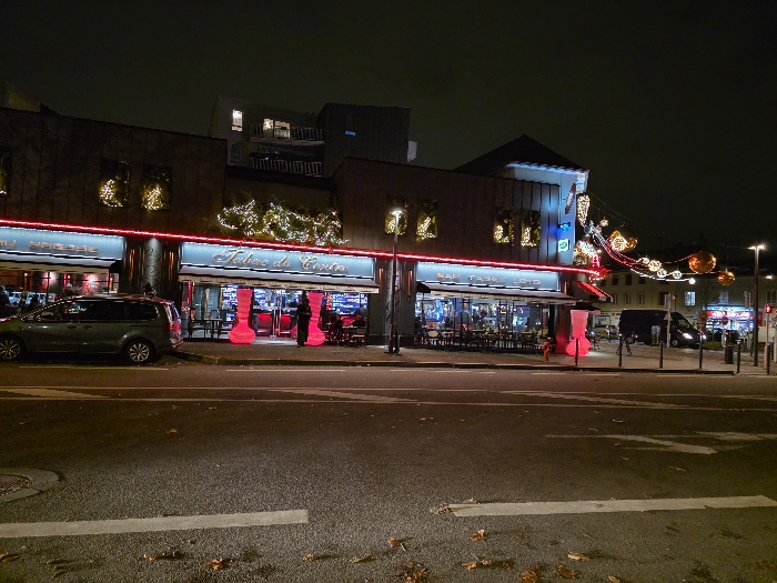 At night, a street scene shows a row of buildings with brightly lit storefronts. The businesses, labeled "Tabac du Centre" and "Bar Tabac Loto," are adorned with holiday lights and red neon accents. A dark minivan is parked on the street. Ornaments hang overhead, adding a festive touch to the urban landscape. The street is illuminated by streetlights and reflections from the store windows.