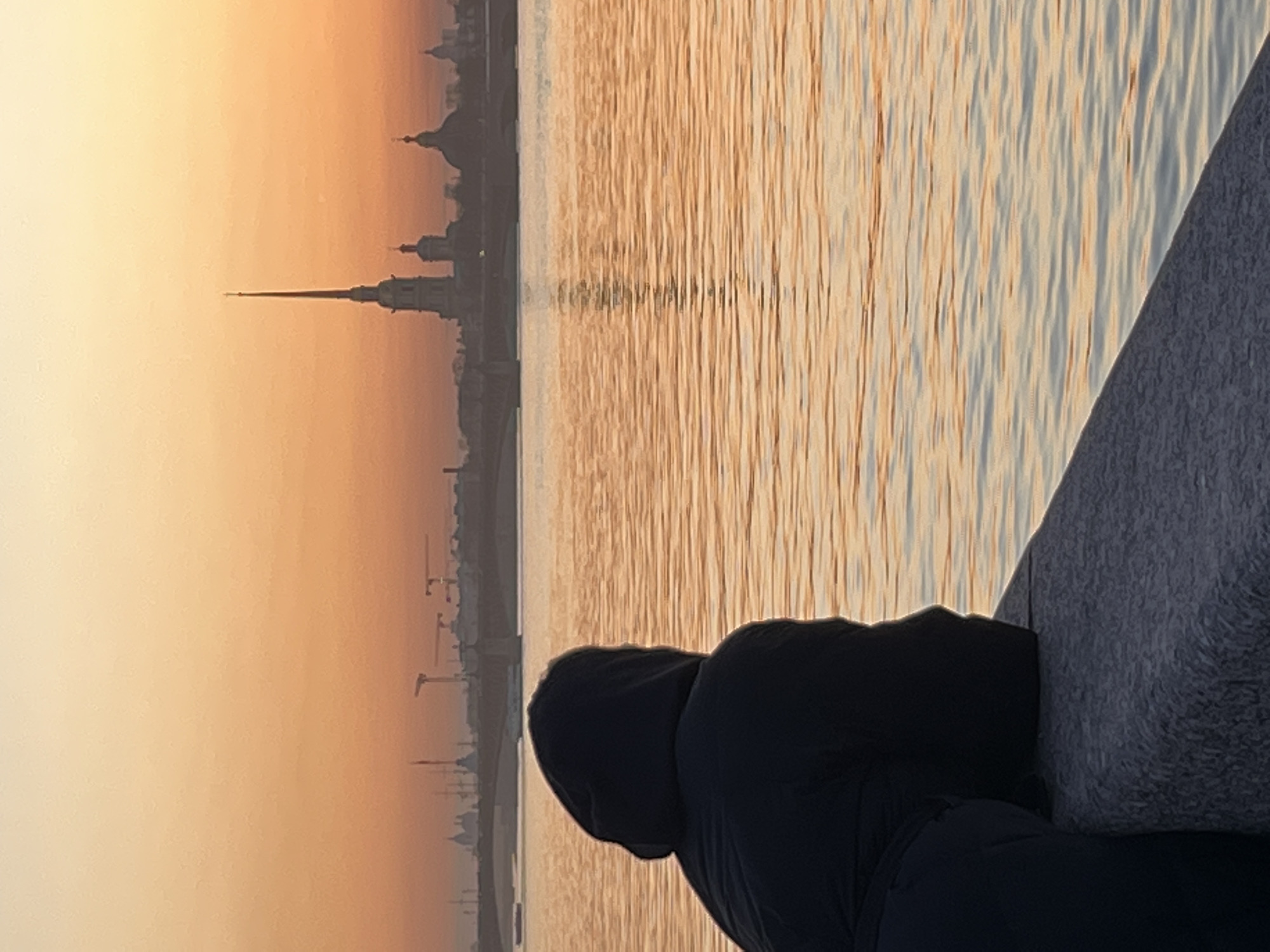 A person is sitting on a granite embankment, looking towards the Neva River and the cityscape of Saint Petersburg, Russia. The Peter and Paul Cathedral spire is visible. The sky is a hazy orange, suggesting either sunset or sunrise. The river's surface reflects the light.