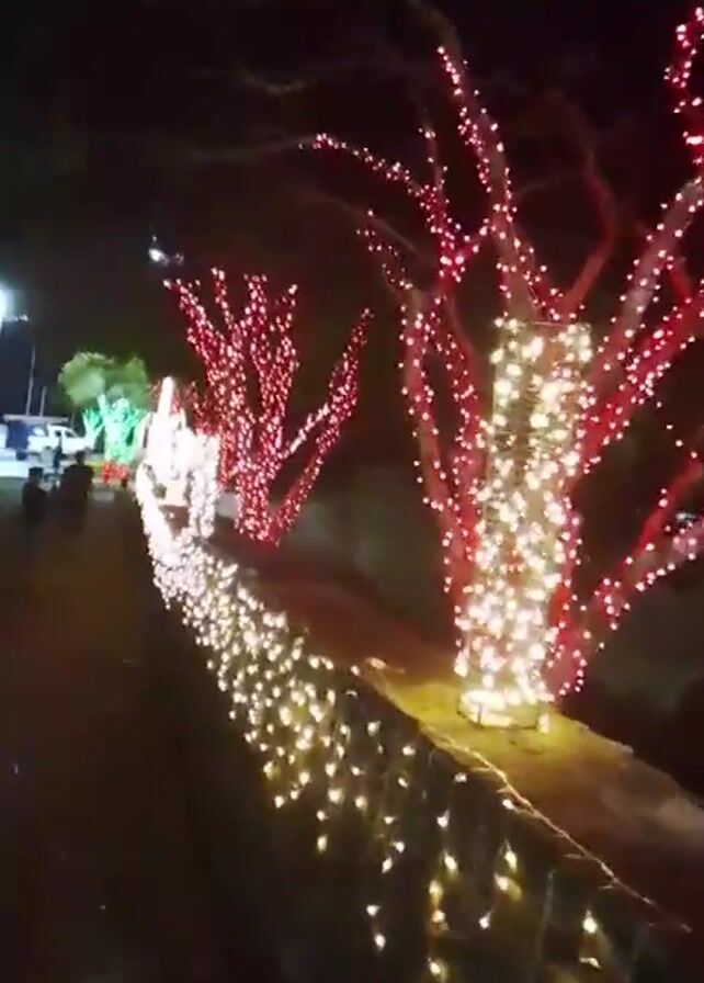 night scene with a stone wall illuminated by strings of warm white lights. Trees are decorated with red and white lights. In the background, a few people walk along a path, with some vehicles and additional lighted trees visible. The scene appears to be a holiday or festive decoration.