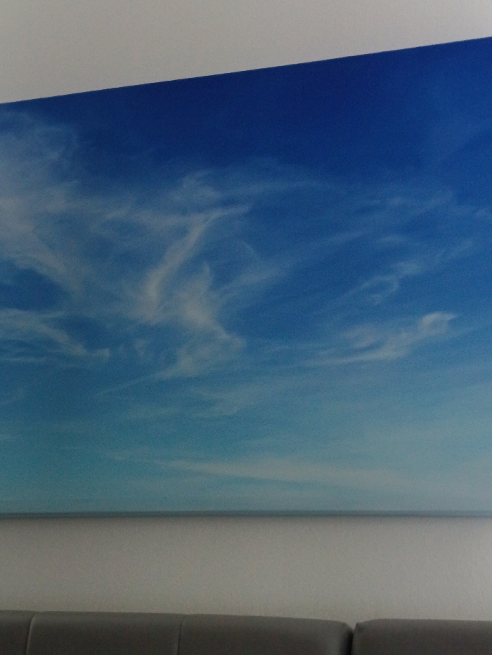Location: Kamenz - Kamjenc, Germany. The scene portrays an indoor environment featuring a large rectangular artwork or mural mounted on a wall. The artwork depicts a clear blue sky, grading from a dark, deep blue at the upper edge to a lighter, more cyan hue towards its lower boundary. Scattered, attenuated white cirrus clouds are discernible across the blue expanse. A subtle, light grey horizontal line is present at the very bottom of the sky depiction, simulating a distant horizon. Directly beneath this artwork, a segment of a light-colored, likely off-white or pale grey, wall is visible. The lower portion of the image displays the top edge of a dark grey, segmented upholstered furniture item, consistent with a sofa or bench. A clean white ceiling is visible at the top of the frame, directly above the artwork. No individuals, subjects, actions, or interactions are present.