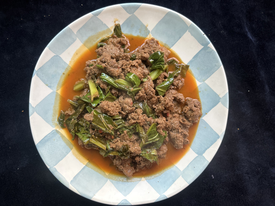 The image displays a close-up, top-down view of a single round ceramic plate filled with prepared food. The dish consists of browned, crumbled meat, intermixed with numerous pieces of dark green, wilted leafy vegetables, all coated in and partially submerged within an orange-red sauce. Small red flecks, possibly chili flakes, are visible throughout the dish. The plate features a light blue and white checkerboard pattern around its rim, with a plain white center where the food rests. The plate is positioned on a dark, uniformly textured surface, possibly black or dark blue fabric, which occupies the background. No people are visible, nor are any actions or interactions depicted. The visual information within the image is insufficient to determine a specific location within the city of Los Angeles, United States, or any other geographical area.