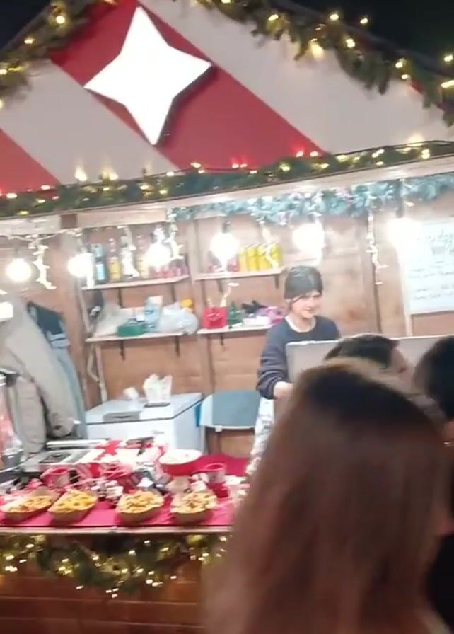 Here's a detailed description of the video: The video shows a Christmas market at night. The focus is on a food stall with a red and white striped roof, decorated with a star. The stall is also adorned with Christmas lights and garland. A woman is working behind the counter, preparing food. In front of the stall, a group of people are gathered, some are talking and looking at the offerings. String lights are strung across the market above the crowd. The overall atmosphere is festive.