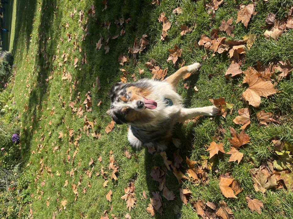 - "A medium-sized Australian Shepherd dog with a blue merle coat, tan markings, white chest and muzzle, and heterochromatic eyes (one blue, one partially blue/brown) is depicted sitting on a sunlit, green grass lawn" by FM-OpQwB2, licensed under CC BY 4.0