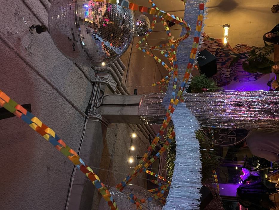The image depicts the interior of Kuki Tuk (Кукі Тук), a restaurant or bar in Dnipro, Ukraine. The scene is illuminated with ambient and decorative lighting, featuring a festive, eclectic aesthetic. The ceiling is a textured, light-colored concrete, revealing exposed industrial pipes and electrical conduits. Multiple strings of multicolored paper chains are suspended across the ceiling, forming an overhead network. Draped below these chains are long garlands of light blue tinsel. Vertical silver tinsel strands hang, creating shimmering columns, one prominent in the lower-center. Two mirrored disco balls are visible: a large one positioned in the upper right quadrant, reflecting various colored lights, and a smaller one further in the background. A horizontal string of warm-toned incandescent bulbs hangs in the mid-ground. Architectural elements include a large, unadorned concrete pillar centrally located, extending from the floor to the ceiling. Walls feature mixed textures, including an area with purple ambient lighting and a partially visible mural or graffiti with the numerical sequence "044" discernible. A black speaker unit is mounted on the wall above this mural, and an Edison-style filament light bulb protrudes from the right wall. Green foliage or potted plants are interspersed throughout the decorated space. Several individuals are present within the establishment. On the far left, a person with dark braided hair is partially visible. Centrally, from the back, a person wearing a light grey short-sleeved shirt stands. In the lower right, multiple individuals are seated at tables, partially obscured, with one person having long dark hair looking towards the left. Interactions are not explicitly clear, but individuals appear to be socializing or dining in a casual environment.