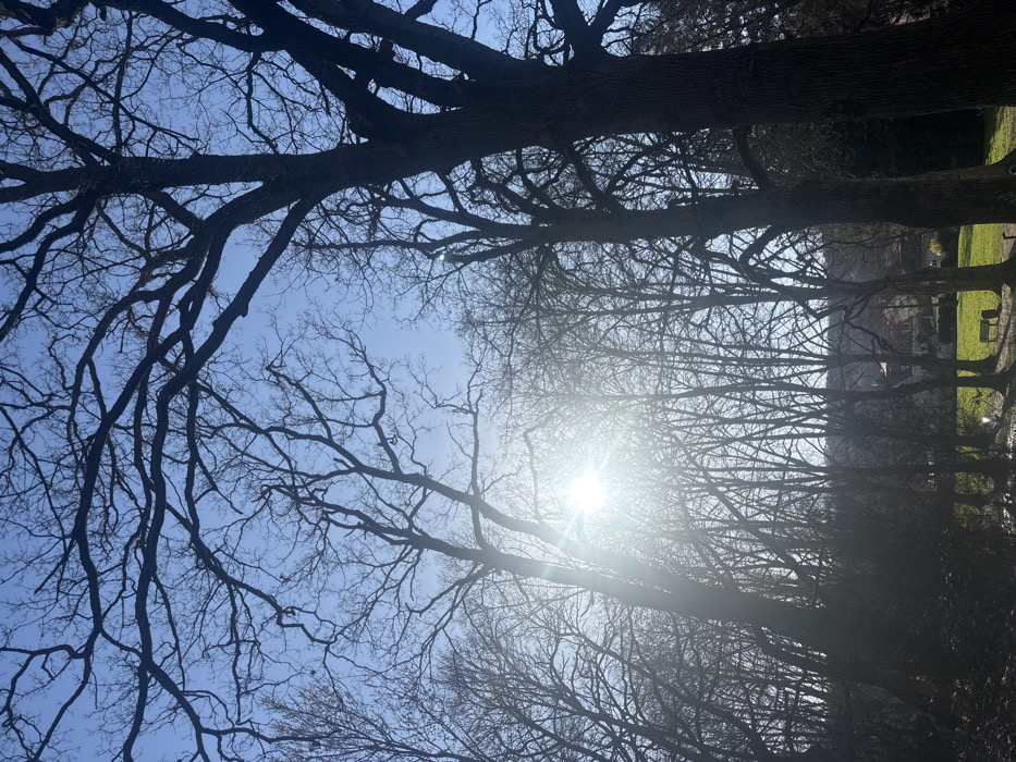 The image displays an outdoor scene within Saint-Rémy-lès-Chevreuse, France, characterized by a park-like or wooded environment under a clear blue sky. Numerous tall, deciduous trees with bare branches dominate the frame, silhouetted against the bright sky, particularly in the upper and side portions. The sun is visible in the upper-left quadrant, emitting a strong glare and lens flare, backlighting the trees. Below the dense tree line, a narrow, dark body of water, consistent with a stream or ditch, traverses the lower-middle section of the image. To the right of this water feature, a patch of sunlit green grass contains a light-colored park bench. In the distance, partially obscured by the tree trunks and branches, several residential buildings with light-colored facades and reddish roofs are discernible against a tree-covered hillside. No individuals are present in the scene. The absence of leaves on the trees suggests a season of late autumn, winter, or early spring.