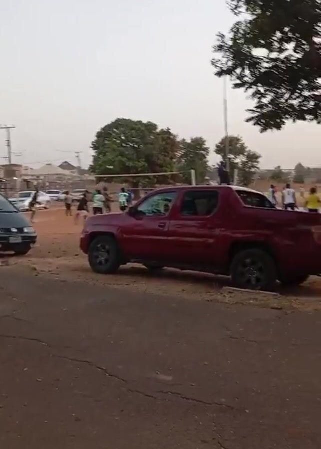 group of people playing volleyball on a dirt court. There are trees around the court. A red Honda Ridgeline pickup truck is parked on the side of the court. A black car is parked further down the road. The sky is overcast.