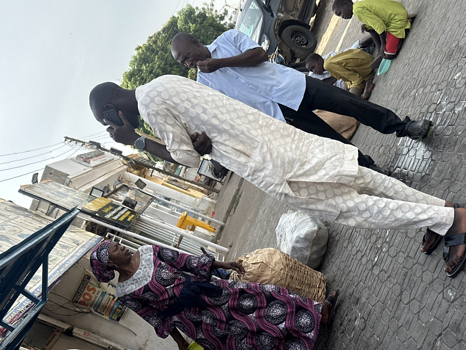 An outdoor scene in Unguwar Sarki, Nigeria, depicts a daytime street environment with multiple individuals and commercial activity