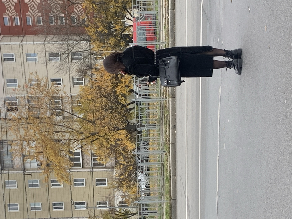 A woman in dark clothing stands on a gray road next to a metal fence. She wears a black jacket, skirt, and boots, carrying a black handbag. A multi-story building with rows of windows is in the background, partially obscured by trees with yellow leaves. A red vehicle is visible further in the background. The image has an overcast, autumnal feel.
