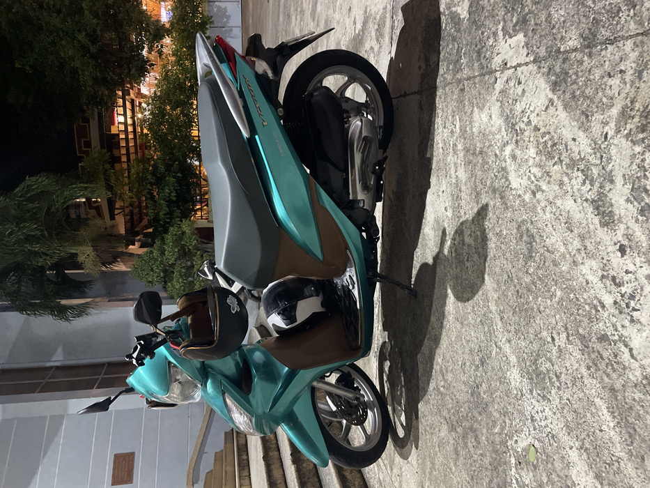 A turquoise and brown Honda Vision scooter is parked on a light-grey concrete surface in Nha Trang, Vietnam, illuminated by artificial light at night